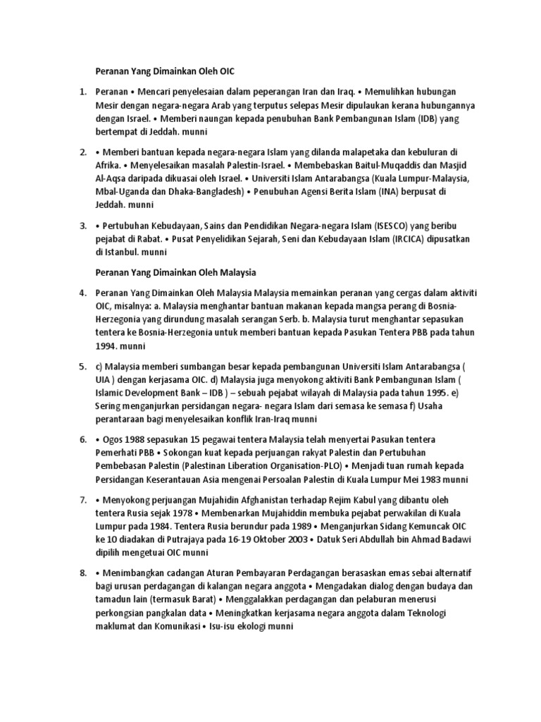 Antara bantuannya ialah memberi bantuan makanan dan perubatan kepada rakyat jelata yang kebuluran akibat perang. Jadinya, ia memerlukan peranan oic dalam menyelesaikan konflik. Pertubuhan asean komanwel oic nam. Malaysia komited memupuk perpaduan dan meningkatkan kerjasama antara. Peranan dan penglibatan malaysia dalam kerjasama serantau dari aspek politik dan keselamatan. Bagi menjamin dan memastikan peranan malaysia yang aktif dalam pbb, malaysia melalui kementerian luar negara, khususnya melalui jabatan bahagian politik pelbagai hala bertindak merumuskan pendirian dan peranan malaysia di pertubuhan tersebut13. Peranan malaysia sebagai anggota oic. O matlamatnya untuk mengeratkan hubungan sesama negara islam dalam segala bidang dan bersuara dalam satu nada. Malaysia juga sering terlibat dalam anjuran persidangan oic dan menyokong kempen seperti projek bank pembangunan islam. Beliau berkata demikian bagi menjawab soalan ahmad tarmizi. Antaranya adalah mengkritik campur tangan rusia di afghanistan , menyokong perjuangan rakyat. Luar negara yang memohon pengiktirafan. Malaysia memainkan peranan yang cergas dalam aktiviti oic, misalnya: