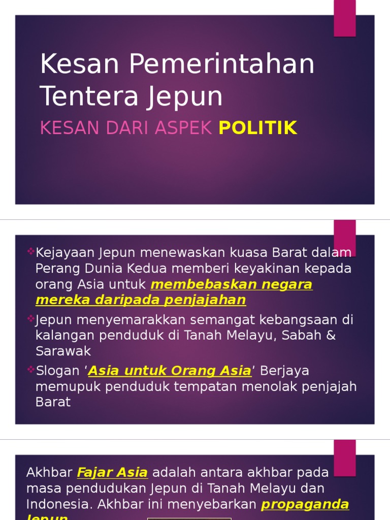Keyakinan kepada orang asia untuk membebaskan negara daripada penjajah menyemarakkan semangat kebangsaan di kalangan penduduk tanah melayu, sabah & sarawak slogan jepun asia untuk orang asia berjaya mempengaruhi pemikiran penduduk tempatan untuk menolak penjajah barat ii. Sebelum menyerang asia tenggara, jepun melancarkan propaganda. Propaganda disiarkan melalui akhbar jepun the syonan. Propaganda asia untuk orang asia. Cikgu sejarah bagus bab 1 pendudukan jepun di negara kita.
